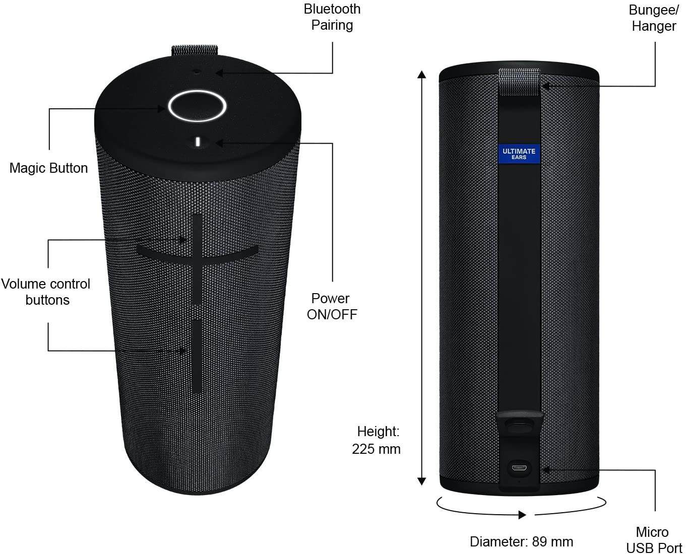 Ultimate Ears MEGABOOM 3 es un altavoz inalámbrico portátil sumamente potente. Emite un sonido fuerte, claro e inmersivo en 360 grados con graves profundos atronadores. Y todo está meticulosamente equilibrado para que escuches cada nota. MEGABOOM 3 también es increíblemente resistente al agua, al polvo y a los golpes, y está listo para rockear cualquier aventura. Desde hacer snowboard en las montañas hasta hacer breakdance en la piscina, MEGABOOM 3 te respalda. Y con el nuevo botón mágico, puedes reproducir, pausar y saltar canciones con solo un toque. Además, toda esta genialidad viene envuelta en una impresionante tela de alto rendimiento bietono. El mejor animador de fiestas ha sido redefinido. Nivel máximo de sonido 90dBA