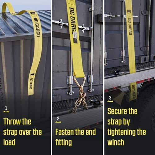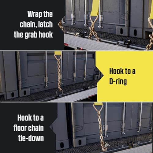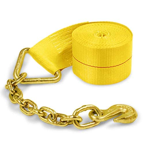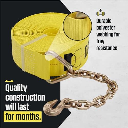 1. TRANSPORTE EQUIPO PESADO CON TRANQUILIDAD Dos (2) correas de amarre industrial de malacate con gancho de cadena y gancho de agarre aseguran cargas pesadas a su remolque de plataforma. Para usar con malacates de plataforma plana (se venden por separado). Dimensiones: 4 x 30 . Resistencia de rotura de montaje – 16,200 lbs.; Límite de carga de trabajo seguro – 5,400 lbs. 2. DISFRUTE DE FIABILIDAD DURADERA La duradera cinta amarilla de poliéster no absorbe la humedad, se encoge, ni se estira, y es resistente a los rayos UV y la abrasión. Costuras reforzadas para mayor resistencia y durabilidad. Las piezas metálicas de acero están galvanizadas para resistencia a la corrosión;. 3. PREVENGA DAÑOS A SUS AMARRADERAS ¿Por qué los camioneros eligen correas de malacate con extremos de cadena? Las correas tradicionales rozan contra el marco de su remolque y pueden romperse o deshilacharse. La extensión de cadena mantiene la correa alejada de bordes abrasivos y protege la correa. Solo la cadena toca el marco del remolque. 4. FÁCIL DE AMARRAR Los extremos de cadena con ganchos de agarre son compatibles con la mayoría de los puntos de anclaje. Se ancla fácilmente en bolsillos de estaca y carretes. Los extremos de cadena le permiten tirar desde cualquier ángulo sin tensionar la cinta. 5. TODO LO QUE NECESITA EN UNA CORREA DE MALACATE Fuerte, duradero y fácil de usar. Cumple o excede las recomendaciones de WSTDA y las regulaciones del DOT.