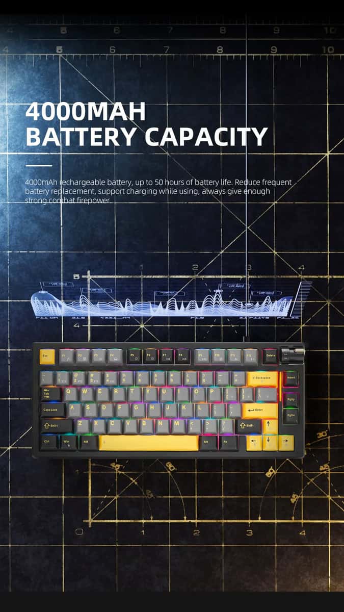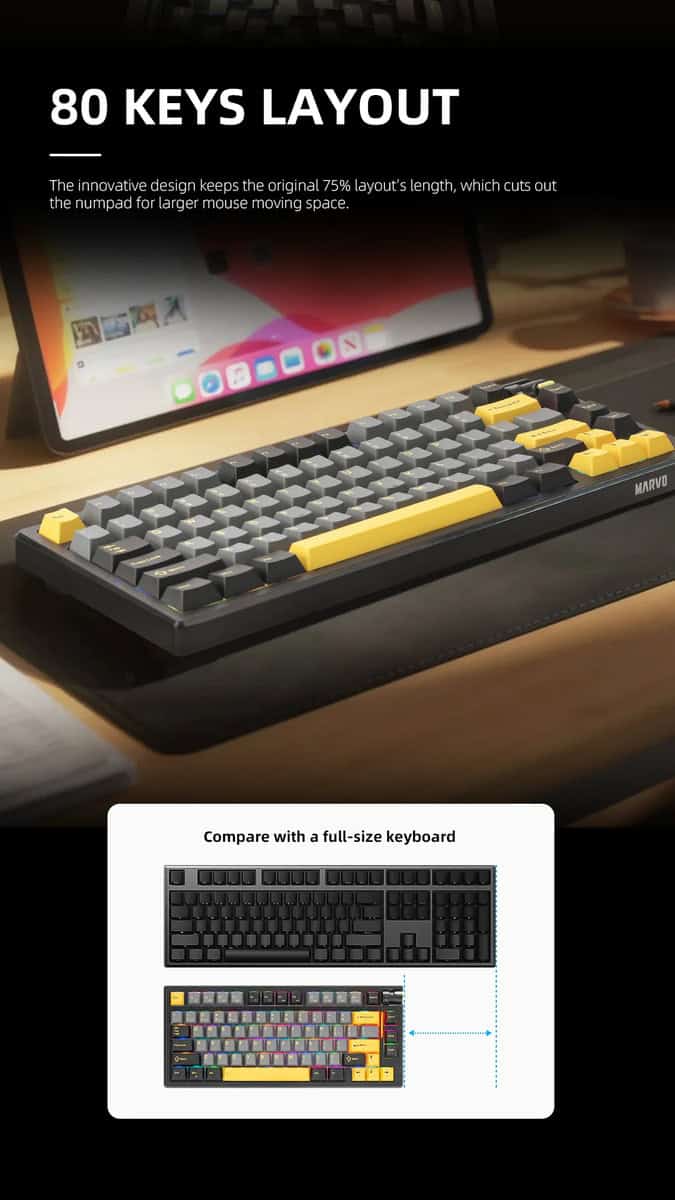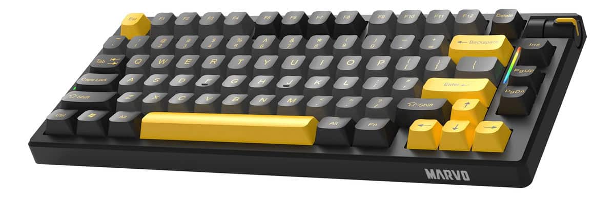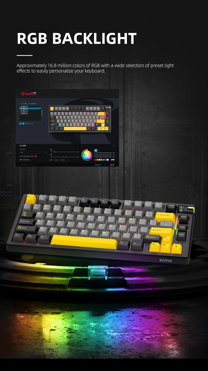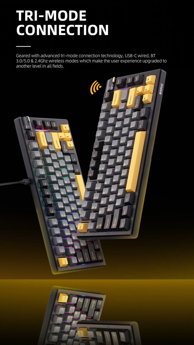 Teclado gamer MARVO KG958W — Mecánico 76%, Inalámbrico/Bluetooth/USB-C, Interruptores Red, Iluminación RGB, Color Negro/Amarillo